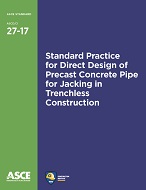 Standard ASCE/CI 27-17 addresses the direct design of precast concrete pipe that will be installed using jacking, a type of trenchless construction. Successful installation of pipe using jacking techniques requires that the engineer design for loading conditions both during and after installation, as well as skillful placement by the installing contractor and precise fabrication of the pipe?all topics covered in this standard.