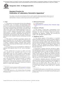 1.1”This practice covers procedures for use in the calibration of volumetric ware, in accordance with Specification E694 such as is in common use in chemical and clinical laboratories. It is based on the gravimetric determination of the quantity of water either contained or delivered, and the conversion of this value to true volume at the standard temperature of 20””’C by means of suitable equations and standard tables. Calibration using mercury is excluded. Calibration may be performed using alternative gravimetric methodology, provided that it is demonstrated and documented that the results obtained are equivalent to those obtained using the methodology described herein.