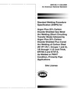 This standard contains the essential welding variables for carbon steel in the thickness range of 1/8 through 1-1/2 inch, using gas metal arc welding (short circuiting transfer mode) with Argon plus 25% Carbon Dioxide shielding for the root followed by flux cored arc welding (globular transfer mode) with Argon plus 25% Carbon Dioxide shielding for the balance. It cites the base metals and operating conditions necessary to make the weldment, the filler metal specifications, and the allowable joint designs for groove welds. This WPS was developed primarily for pipe application.