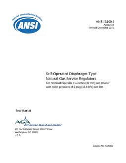 This publication presents a basic standard for the safe and reliable operation and the substantial and durable construction of self-operated diaphragm-type natural gas service regulators for nominal pipe size of 1 1/4 (32 mm) and smaller with outlet pressure of 2 psi (13.8 KPA) and less.